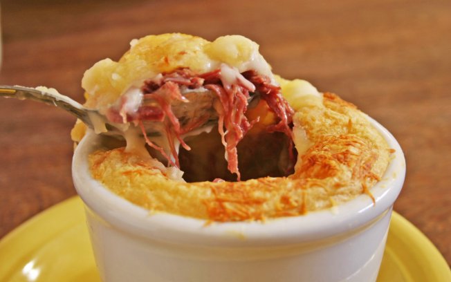Espalhe uma camada fina de purê no fundo de uma assadeira ou em vários refratários de louça como os da foto e distribua o recheio de carne-seca uniformemente. Cubra com o requeijão e, por cima, o restante do purê. Finalize com o queijo de coalho ralado e asse a 200º até dourar.